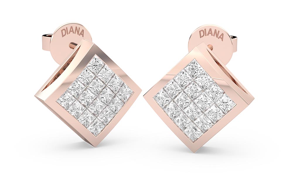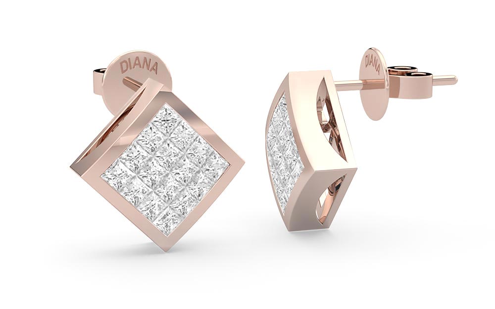 A real showstopper, these stud earrings feature shimmering princess-cut diamonds in an invisible setting. Complete with a smooth carpet of diamonds, these earrings offer maximum sparkle and brilliance.