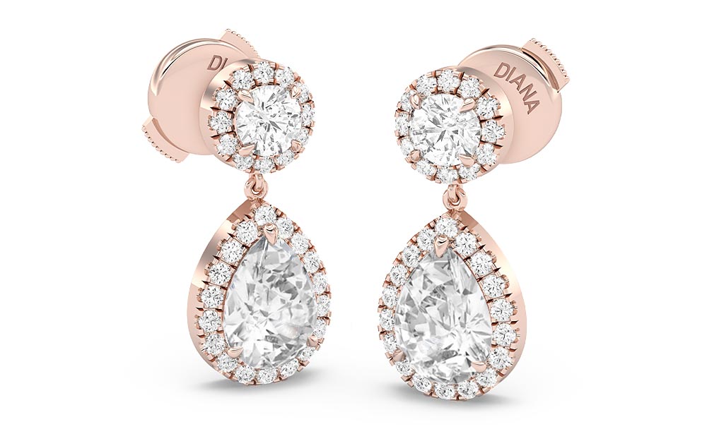 A real showstopper, these drop earrings feature pear-shaped diamonds hanging from brilliant round-cut diamonds. With diamond security a top priority, these earrings include Swiss guardian backs which lock into place.