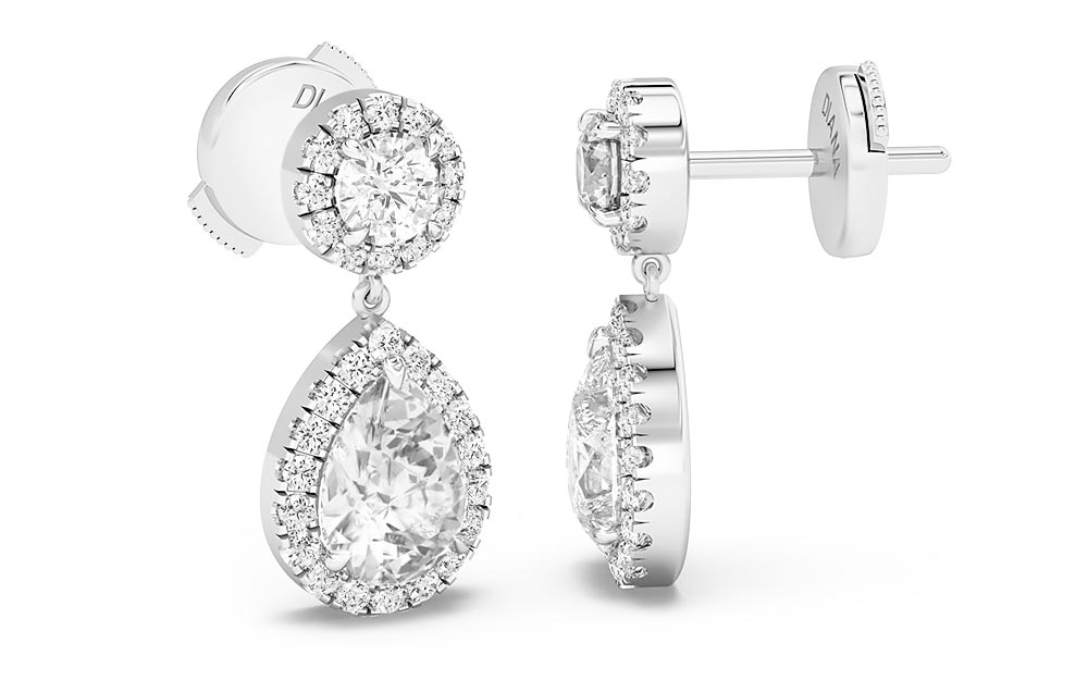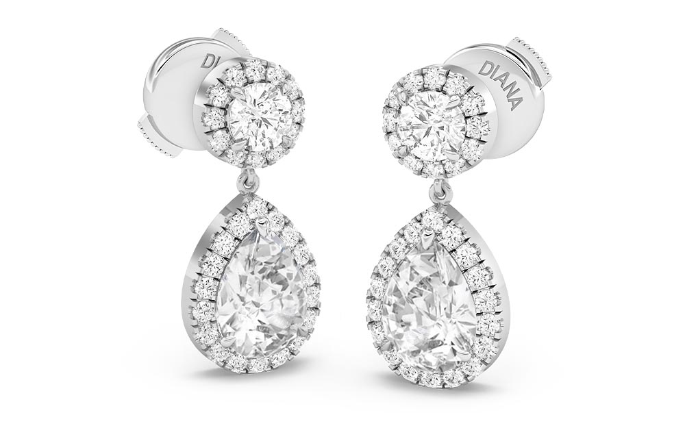 A real showstopper, these drop earrings feature pear-shaped diamonds hanging from brilliant round-cut diamonds. With diamond security a top priority, these earrings include Swiss guardian backs which lock into place.