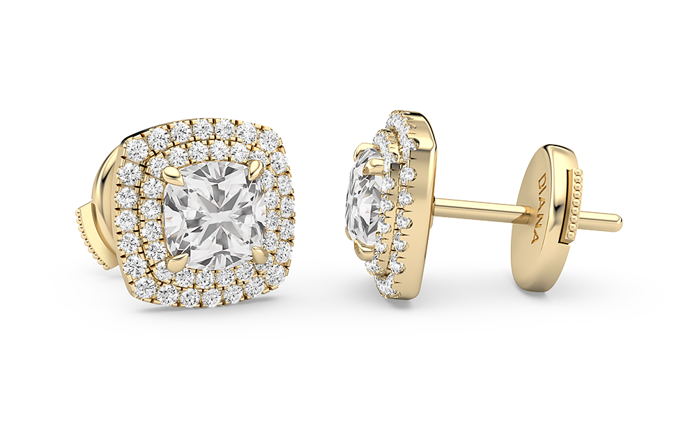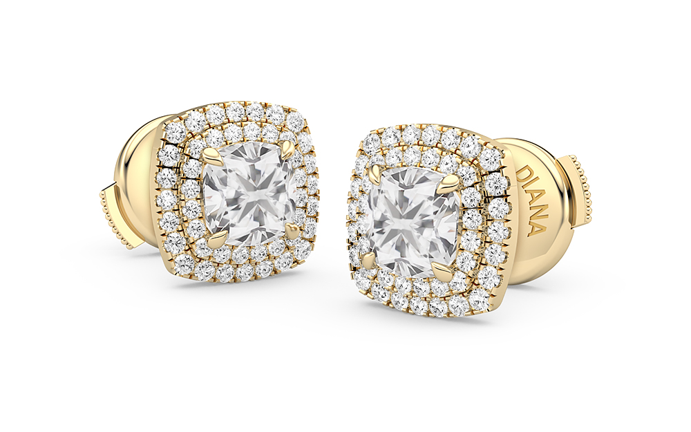 Radiating from afar, these stud earrings feature a pair of cushion-cut diamonds surrounded by a double halo of shimmering accent diamonds. Complete with Swiss guardian backs which lock into place, these earrings offer maximum security.