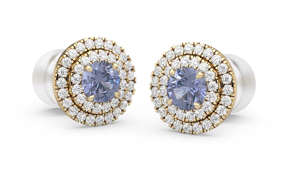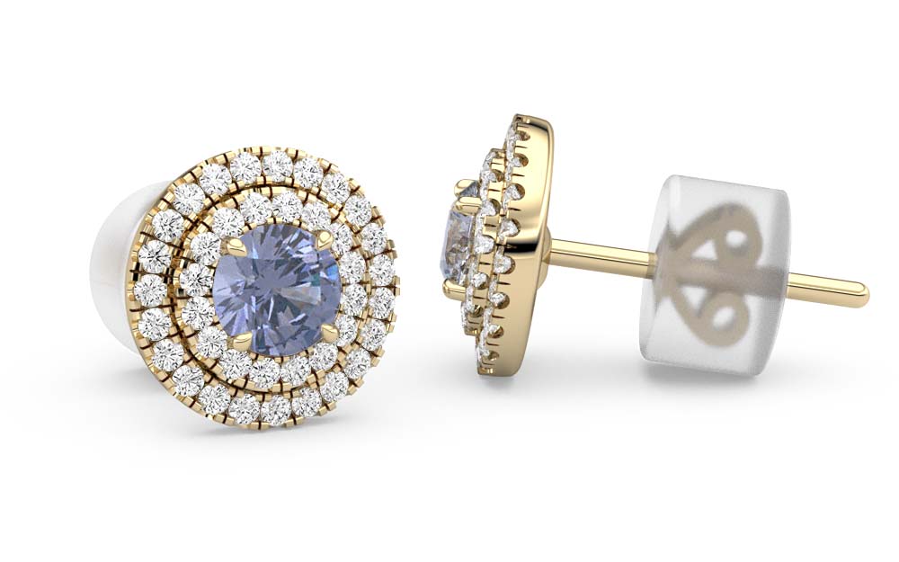 Emitting a gorgeous violet-blue hue, these stud earrings feature two iolites. Complete with a double halo of shimmering accent diamonds, these earrings are a definite eye-catcher.