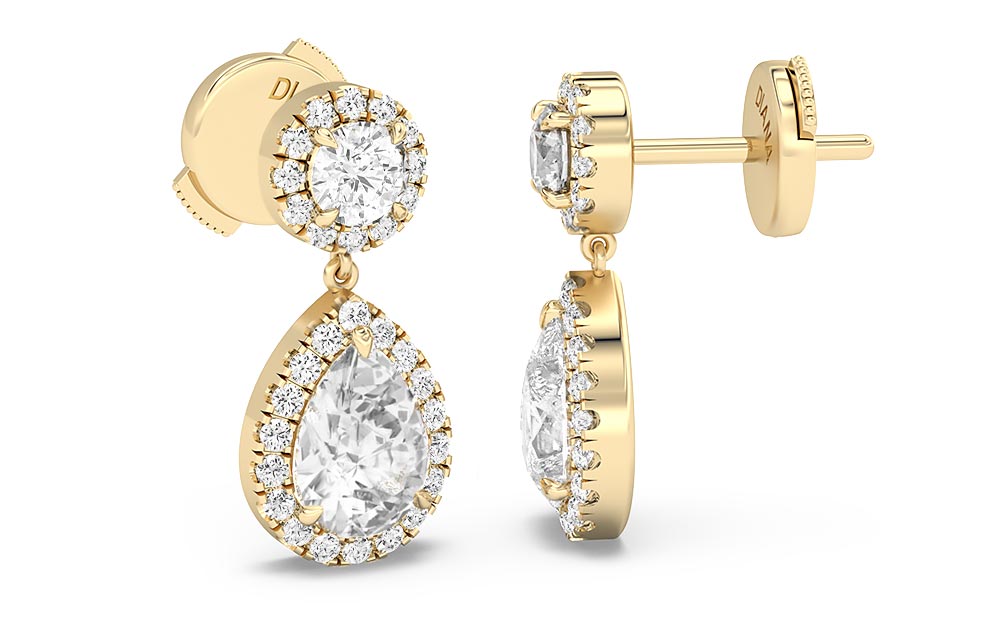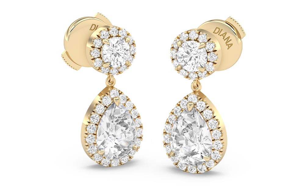 A real showstopper, these drop earrings feature pear-shaped diamonds hanging from brilliant round-cut diamonds. With diamond security a top priority, these earrings include Swiss guardian backs which lock into place.