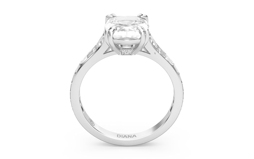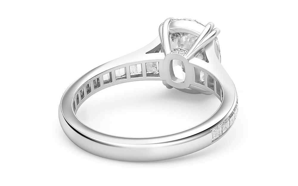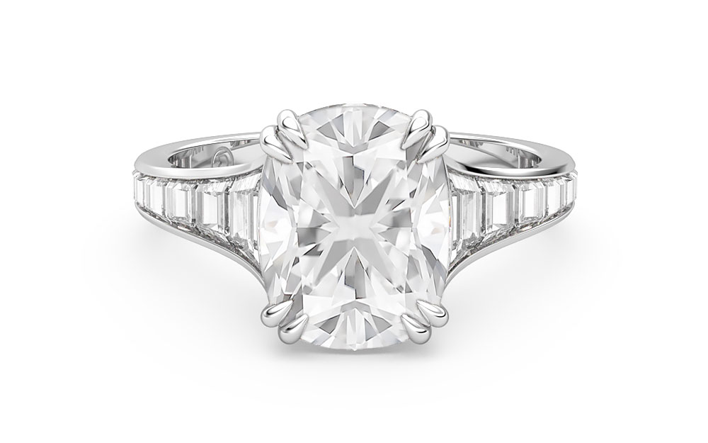 An absolute stunner, this engagement ring features a cushion-cut centre diamond and a row of trapezoid diamonds that gradually increase in size as they get closer to the centre.