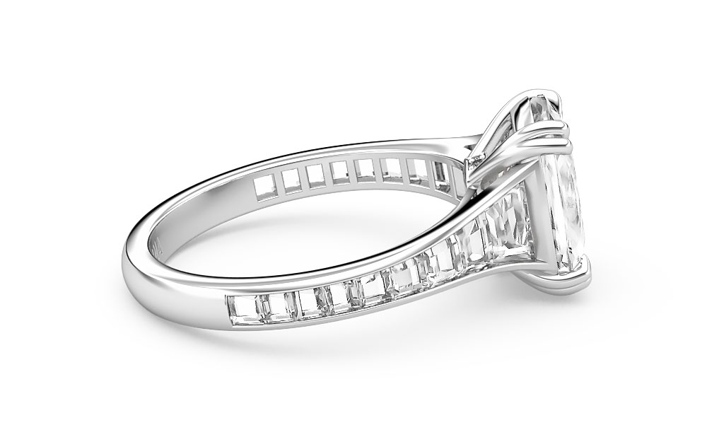 An absolute stunner, this engagement ring features a cushion-cut centre and a row of trapezoid diamonds that gradually increase in size as they get closer to the centre.