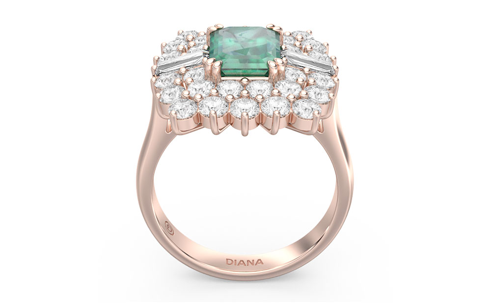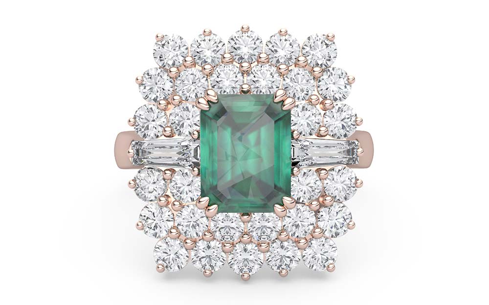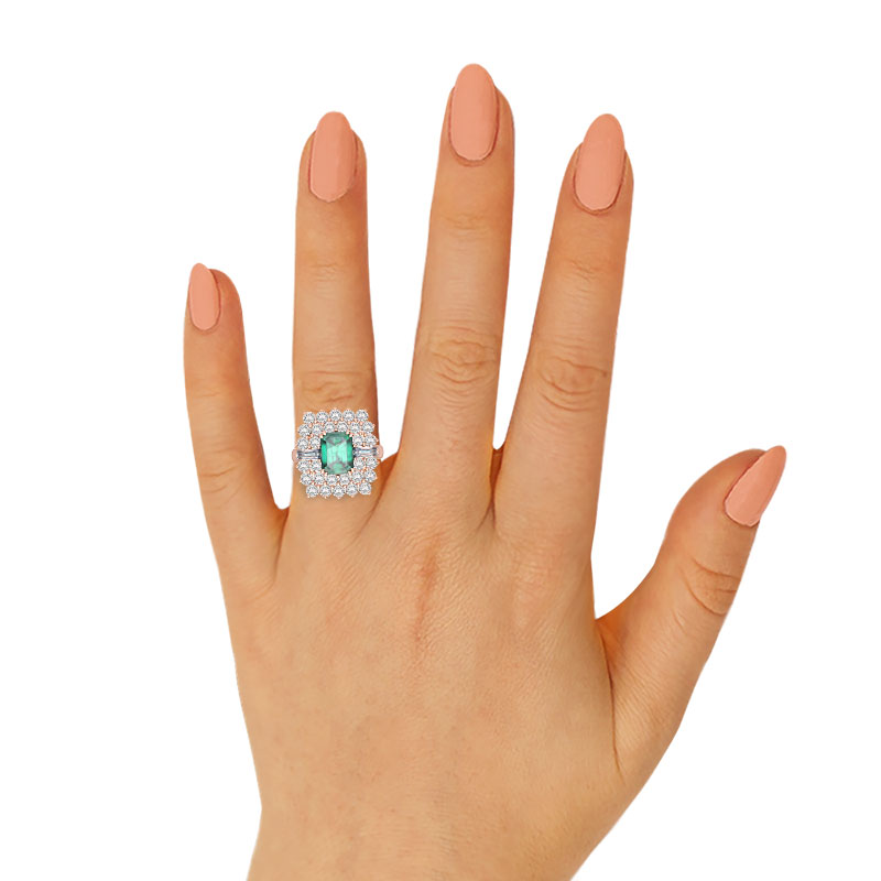 Dazzling from afar, this ring features a double diamond halo and two baguette diamonds framing a natural emerald. Truly breathtaking, this ring is a must-have for special occasions.