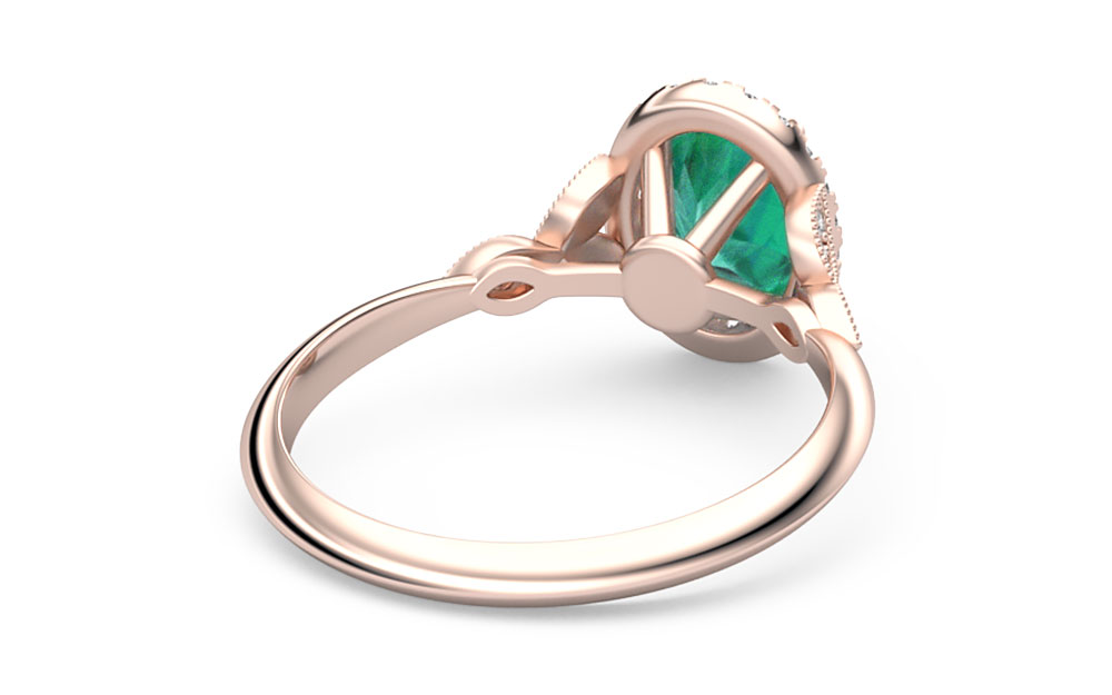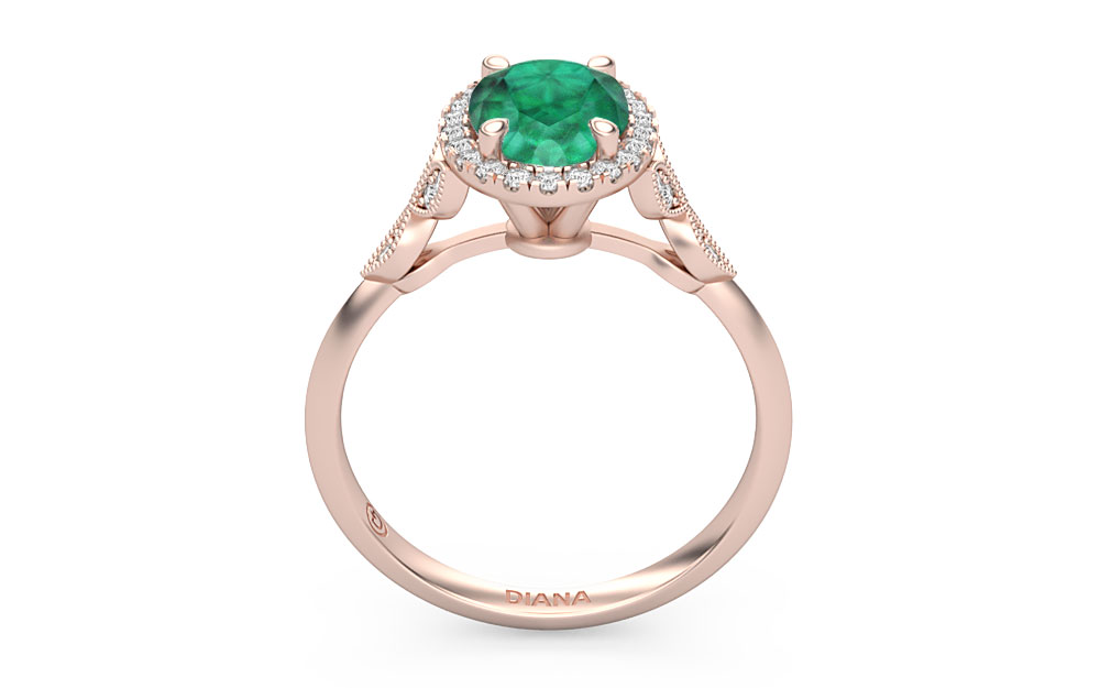 This vintage-inspired ring features an oval-shaped emerald surrounded by a sparkling diamond halo. Complete with delicate milgrain, this design is a definite eye-catcher.