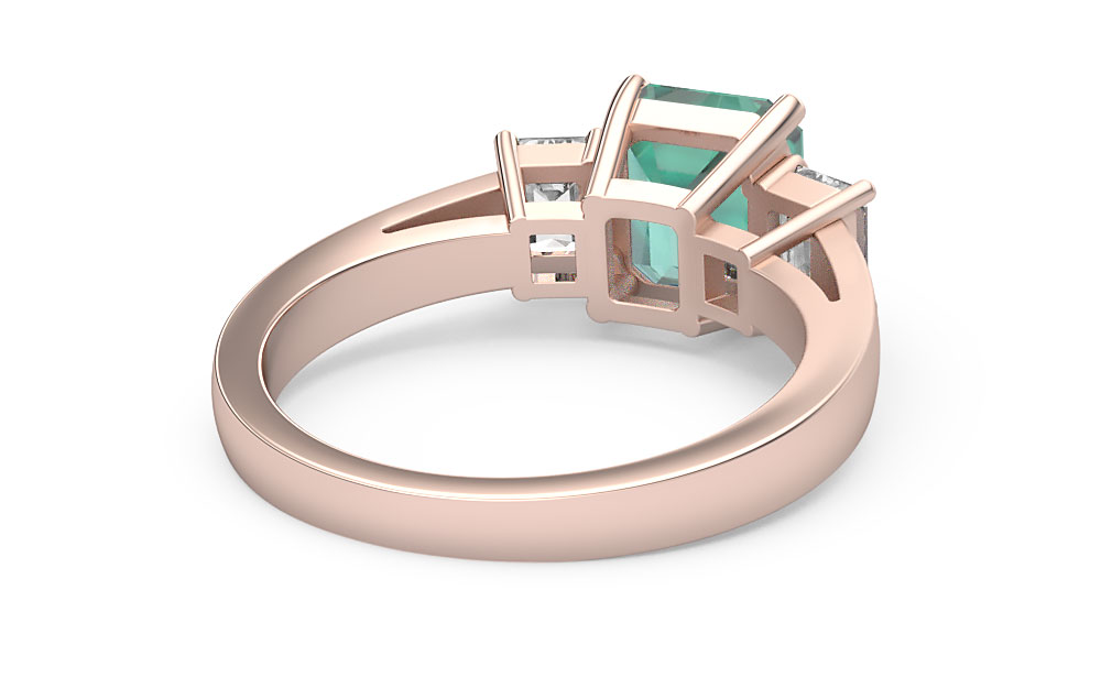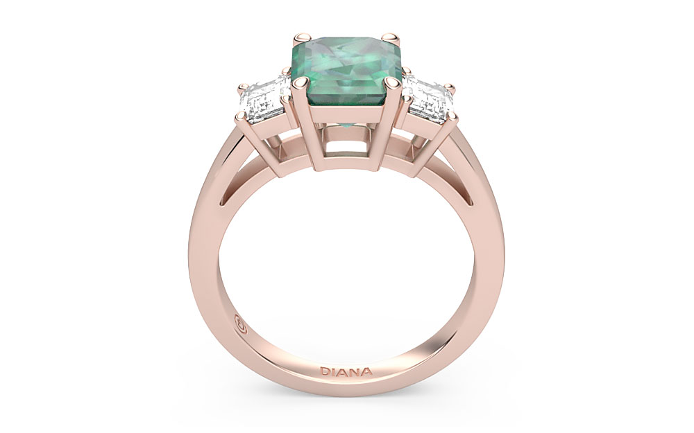 This stunning trilogy ring features two perfectly matched emerald-cut diamonds on either side of a gorgeous green hued emerald. A timeless classic, this design has a unique charm.