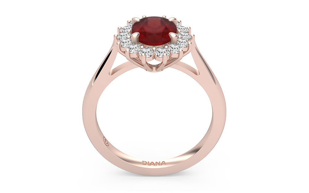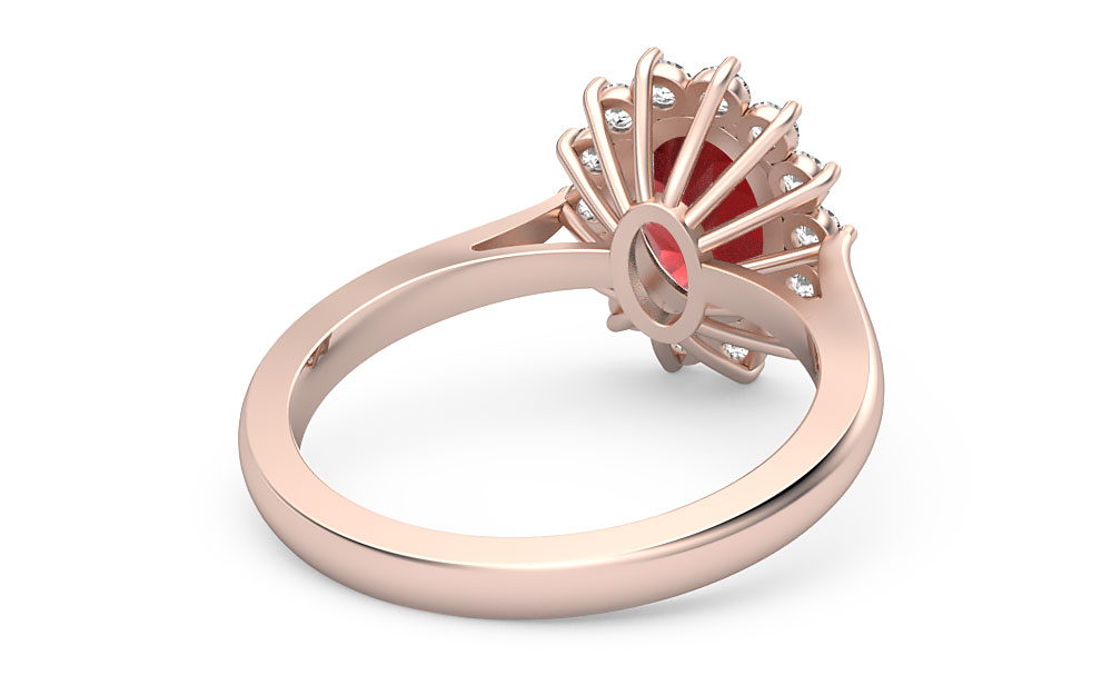 This timeless red hued gemstone ring features an oval-shaped ruby. Complete with a dazzling diamond halo, this design offers the perfect balance of beauty and sparkle.