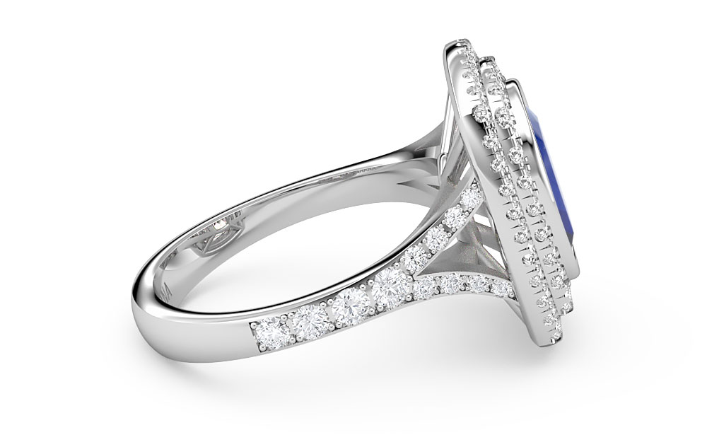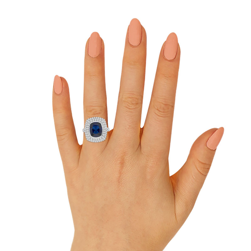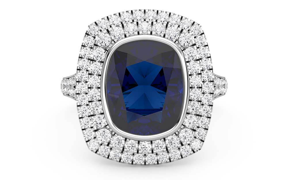 elegant, this ring features a cushion-cut sapphire framed by a double diamond