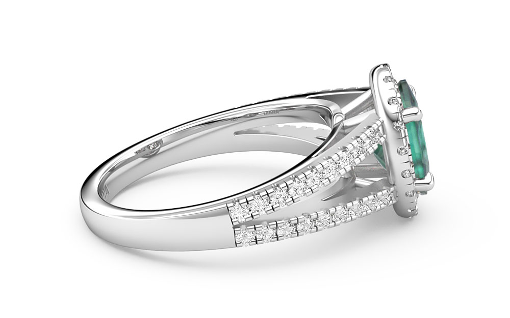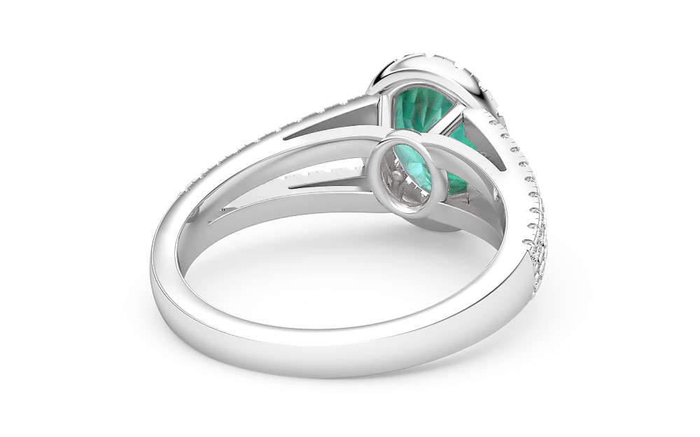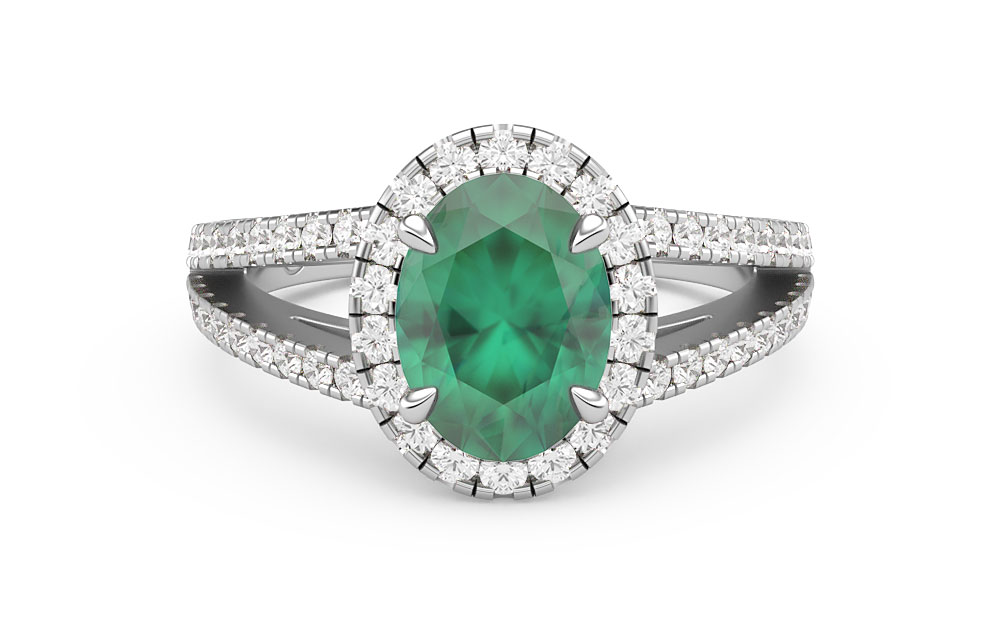a gorgeous green, this ring features an oval-cut emerald framed by a dazzling