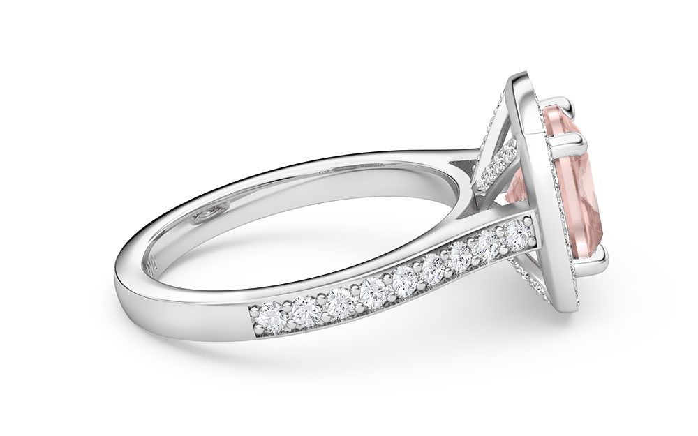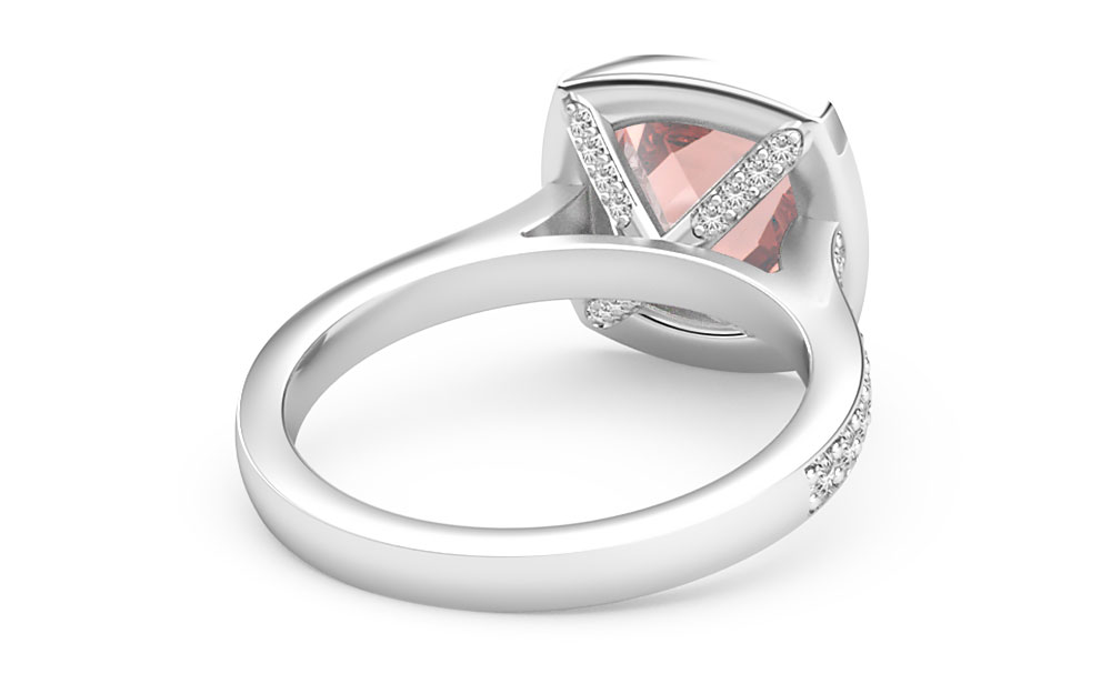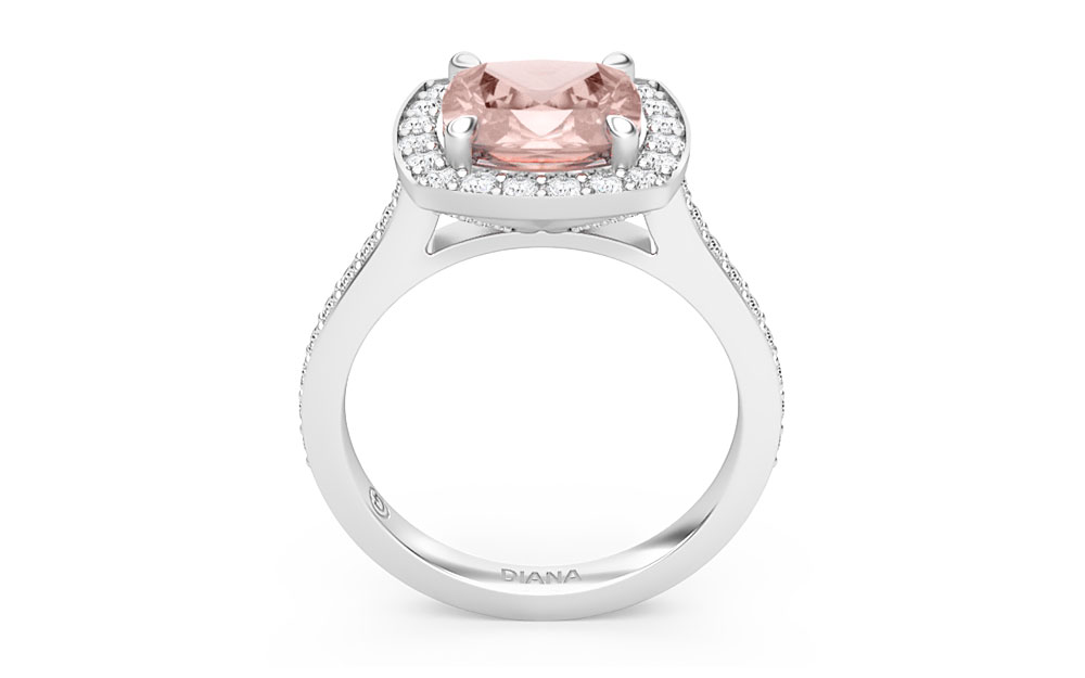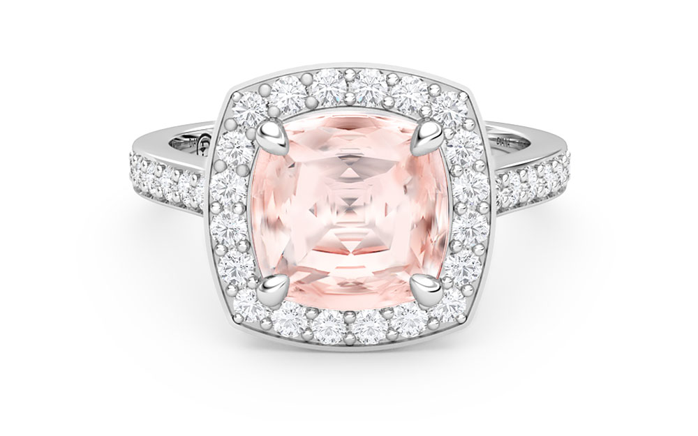 pink beauty, this ring features a cushion-cut morganite framed by a diamond