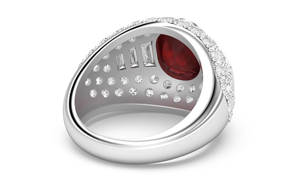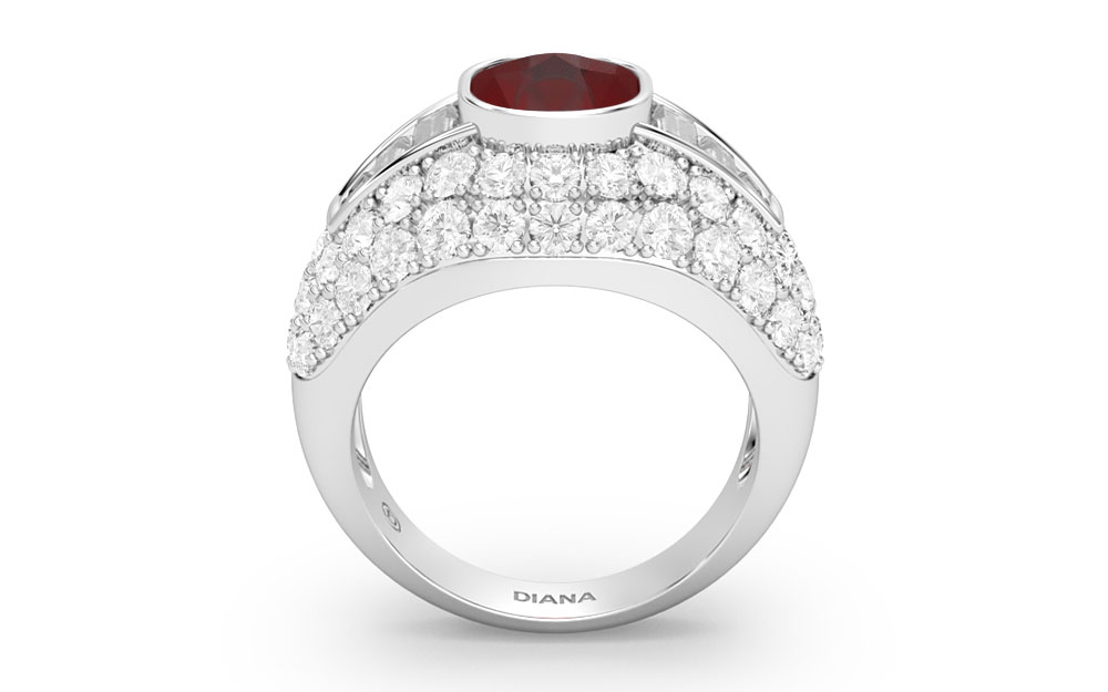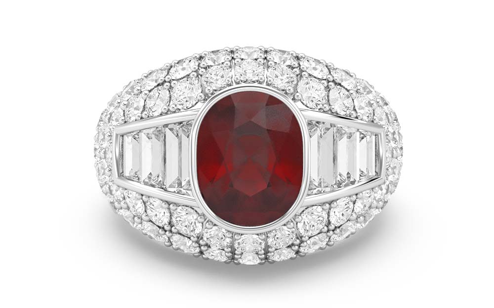 beautiful red hue, this ring features an oval-shaped ruby in a bezel setting. Complete