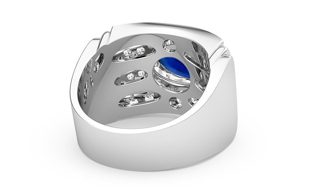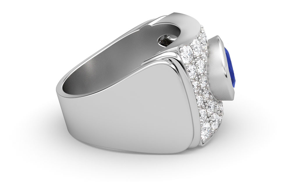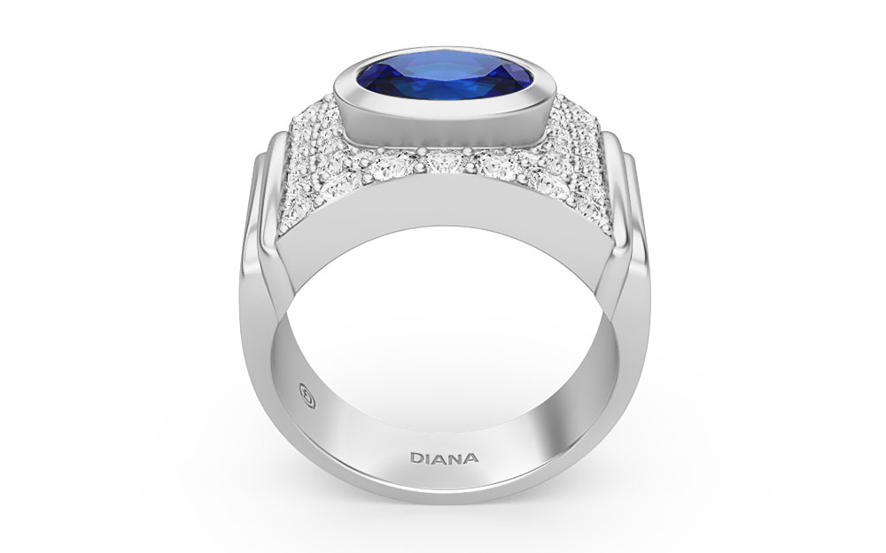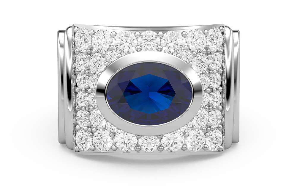 afar, this ring features an oval-shaped sapphire in a bezel setting. Complete