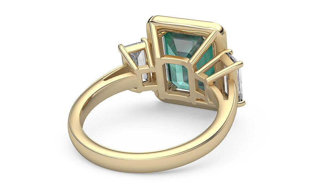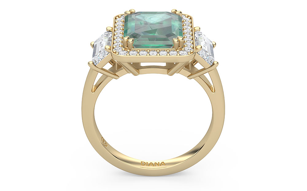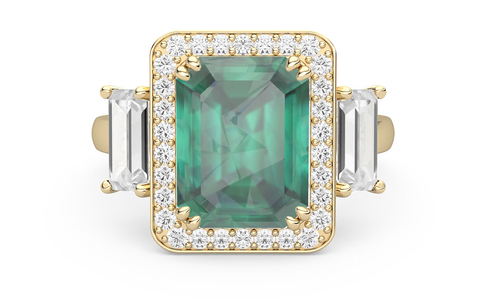 A timeless beauty, this ring features a green hued emerald framed by a shimmering diamond halo. Complete with baguette diamonds, this ring is a definite eye-catcher.