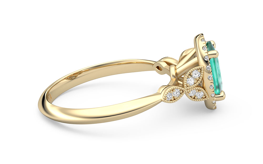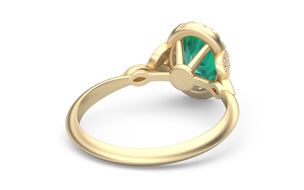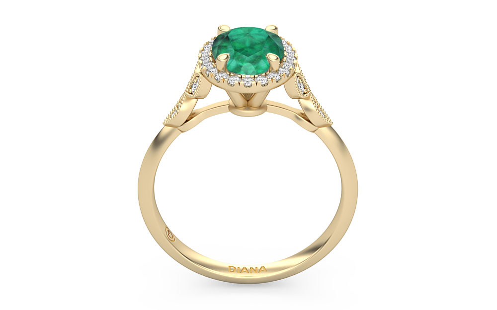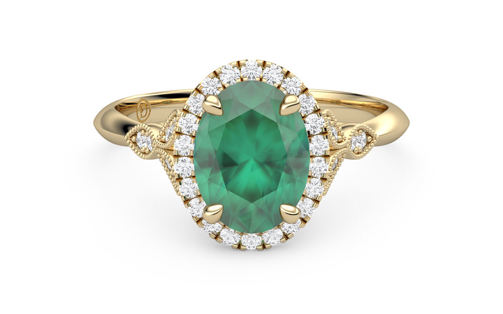 This vintage-inspired ring features an oval-shaped emerald surrounded by a sparkling diamond halo. Complete with delicate milgrain, this design is a definite eye-catcher.