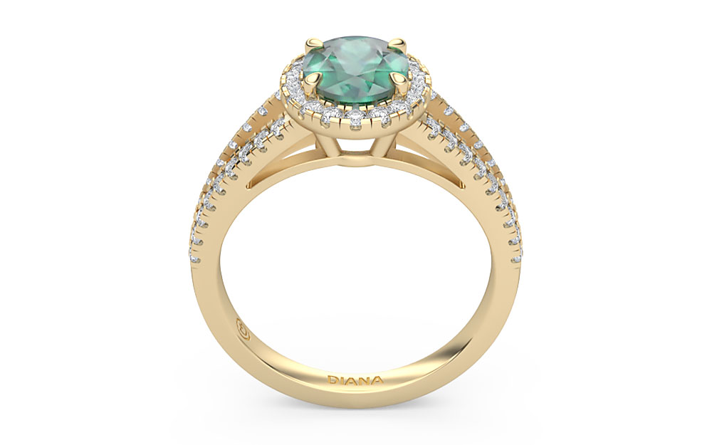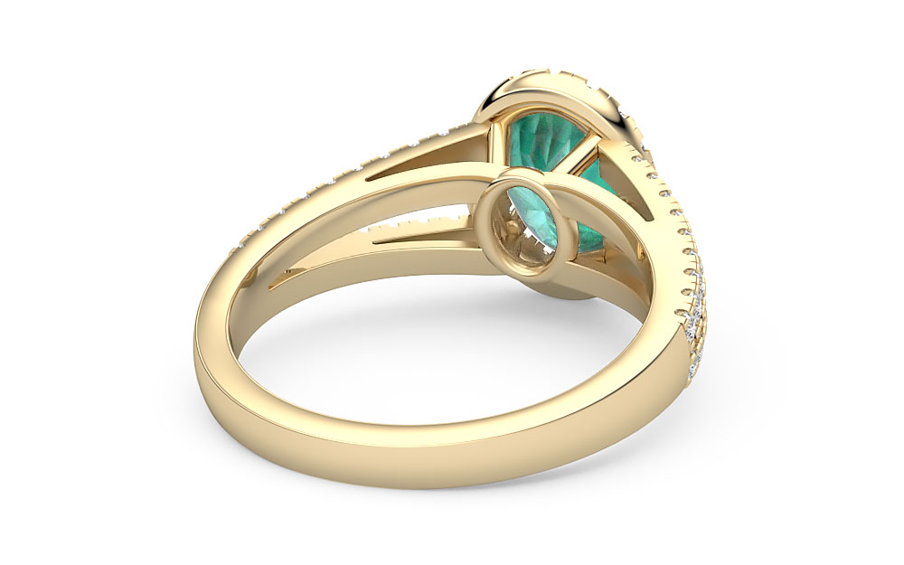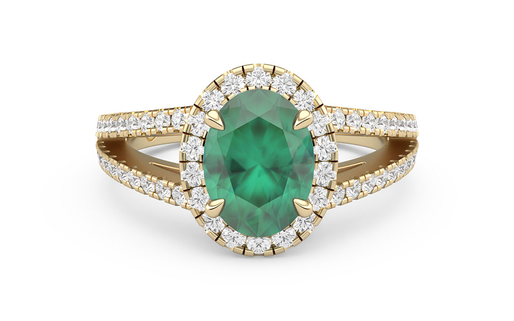 Glistening a gorgeous green, this ring features an oval-cut emerald framed by a dazzling diamond halo. Complete with a diamond-studded split shank, this design offers maximum brilliance.