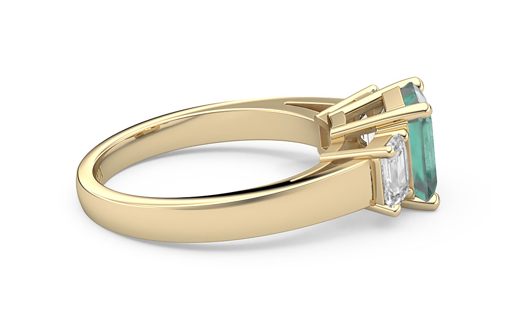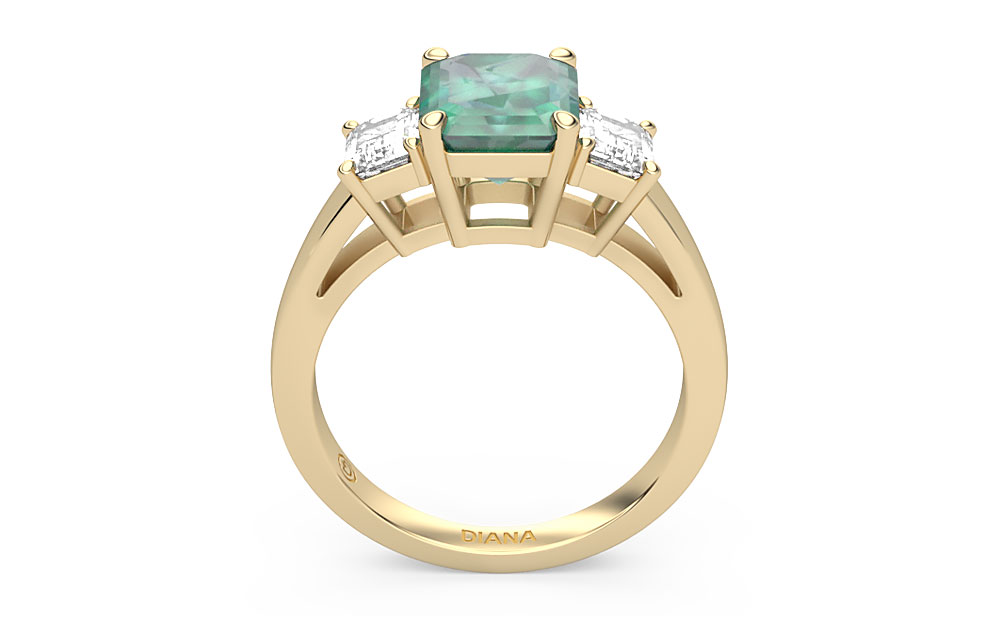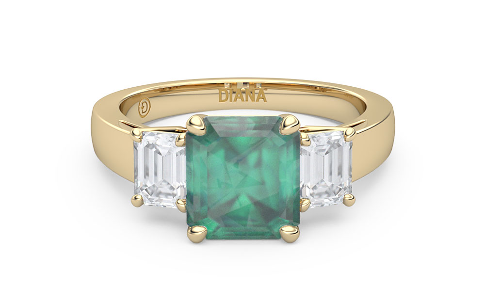 This stunning trilogy ring features two perfectly matched emerald-cut diamonds on either side of a gorgeous green hued emerald. A timeless classic, this design has a unique charm.