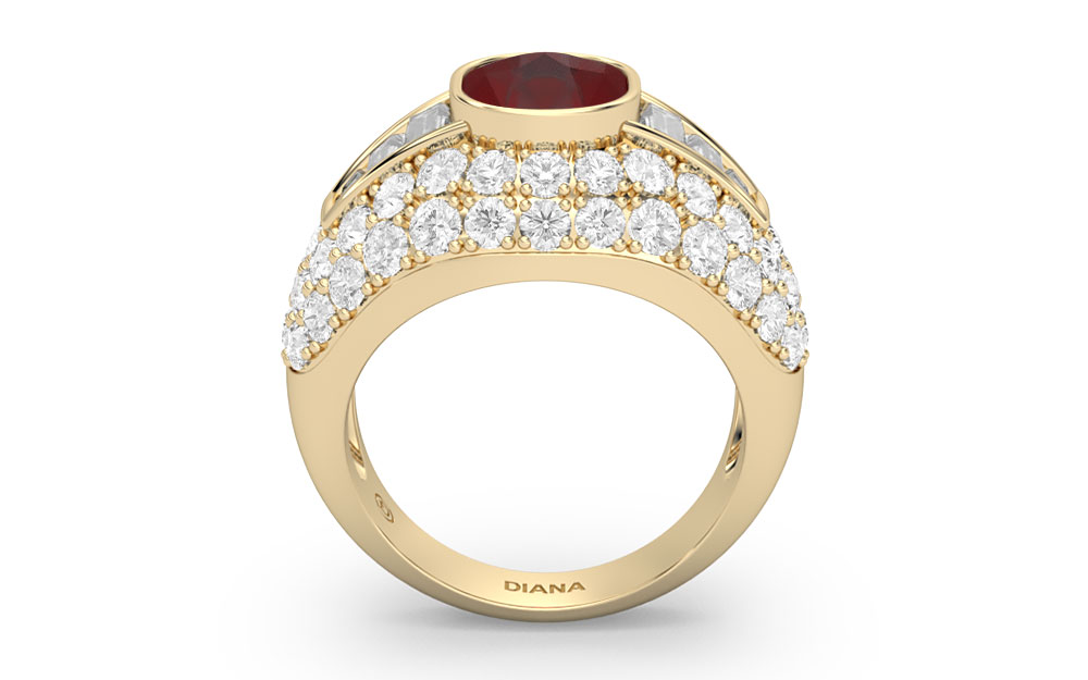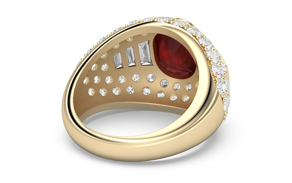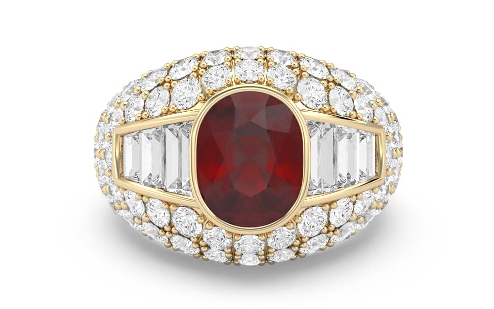 Emitting a beautiful red hue, this ring features an oval-shaped ruby in a bezel setting. Complete with round and baguette accent diamonds, this ring is a definite eye-catcher.