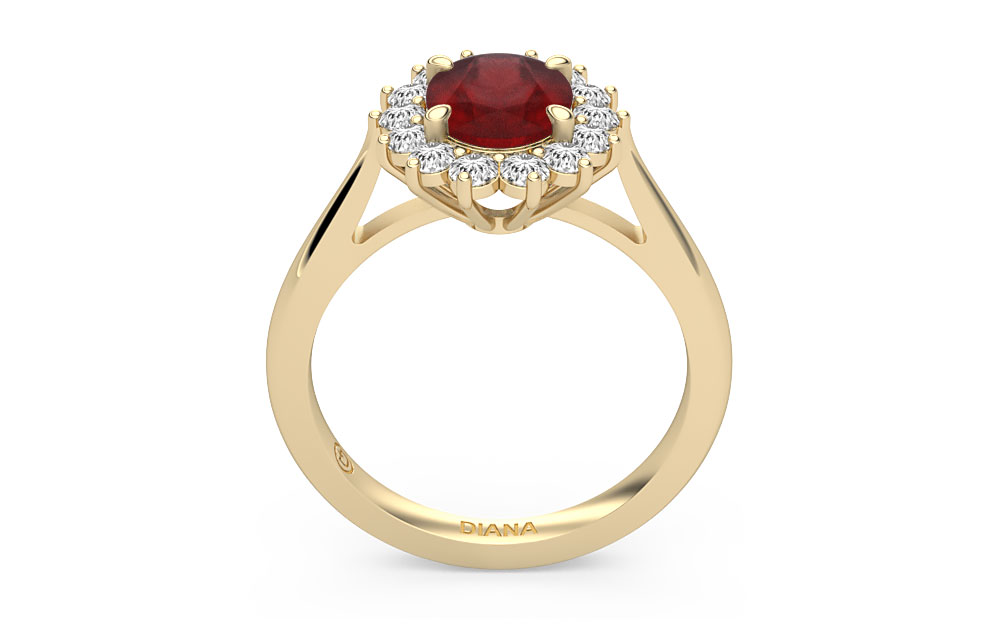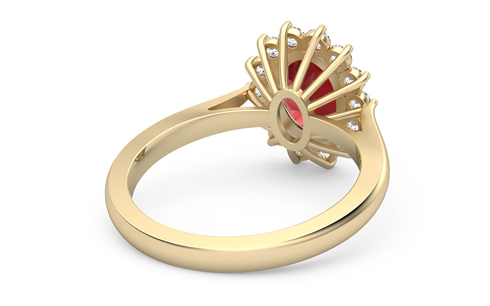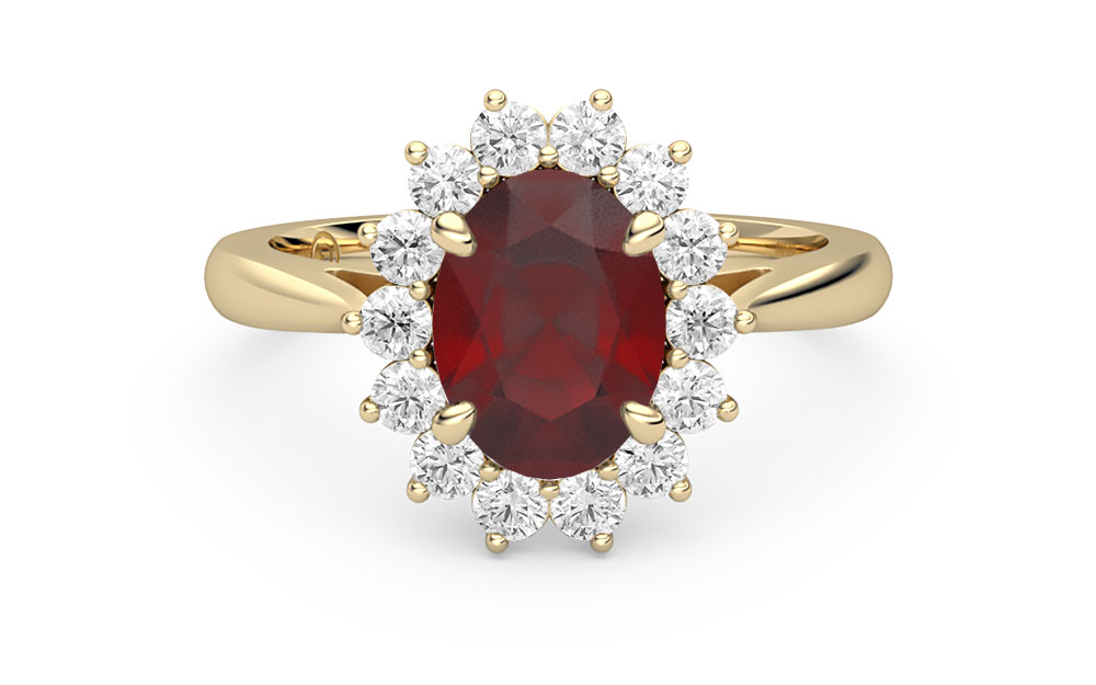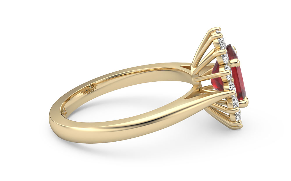 This timeless red hued gemstone ring features an oval-shaped ruby. Complete with a dazzling diamond halo, this design offers the perfect balance of beauty and sparkle.