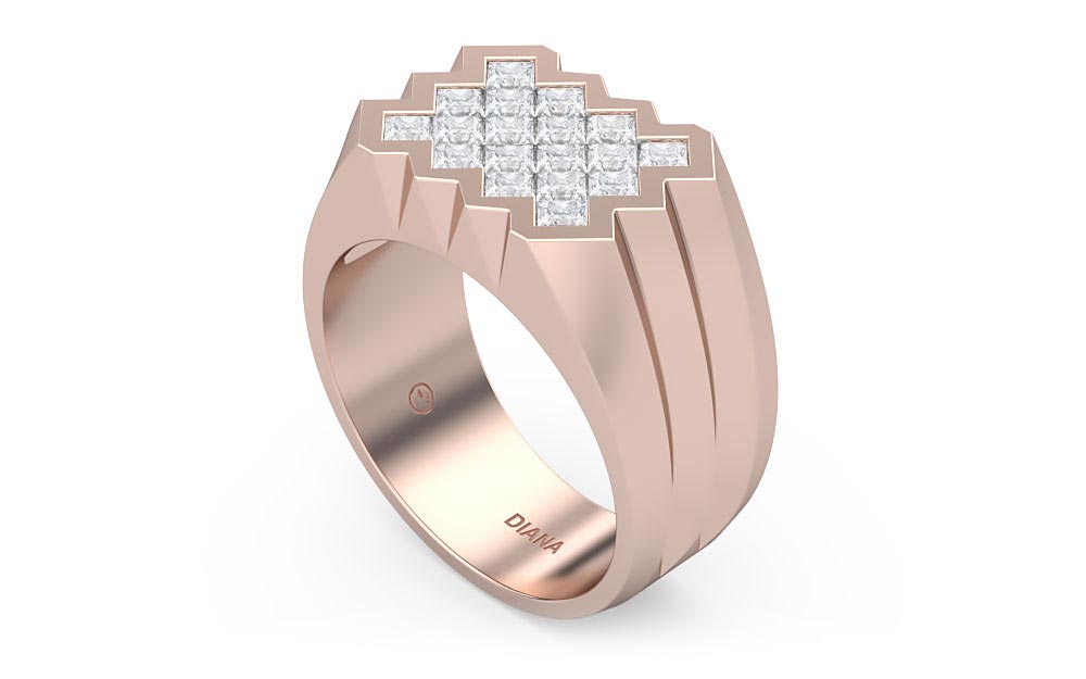 This striking ring features dazzling princess-cut diamonds diagonally set in an invisible