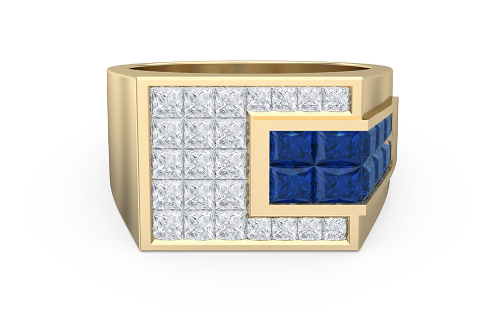 unique, this ring features princess-cut diamonds in an invisible setting. Complete