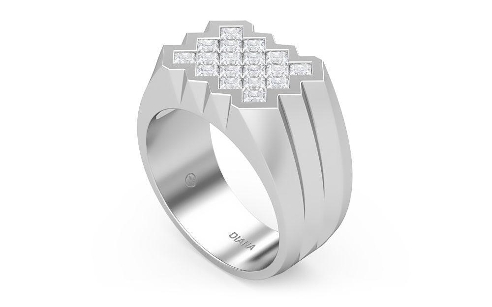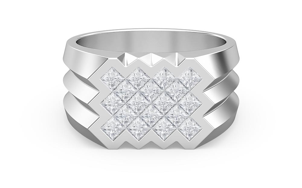 This striking ring features dazzling princess-cut diamonds diagonally set in an invisible